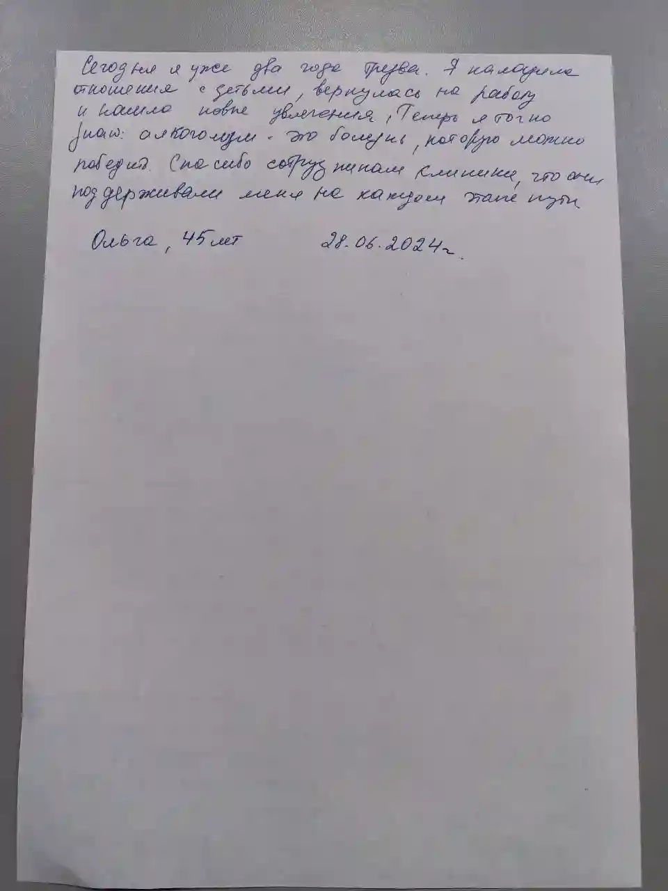 Я наладила отношения с детьми, вернулась на работу и нашла новые увлечения. Теперь я точно знаю: алкоголизм — это болезнь, которую можно победить. Спасибо сотрудникам клиники, что они поддерживали меня на каждом этапе пути.